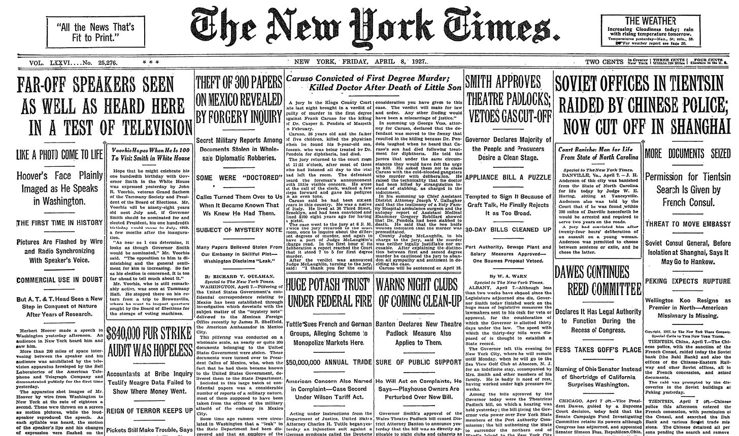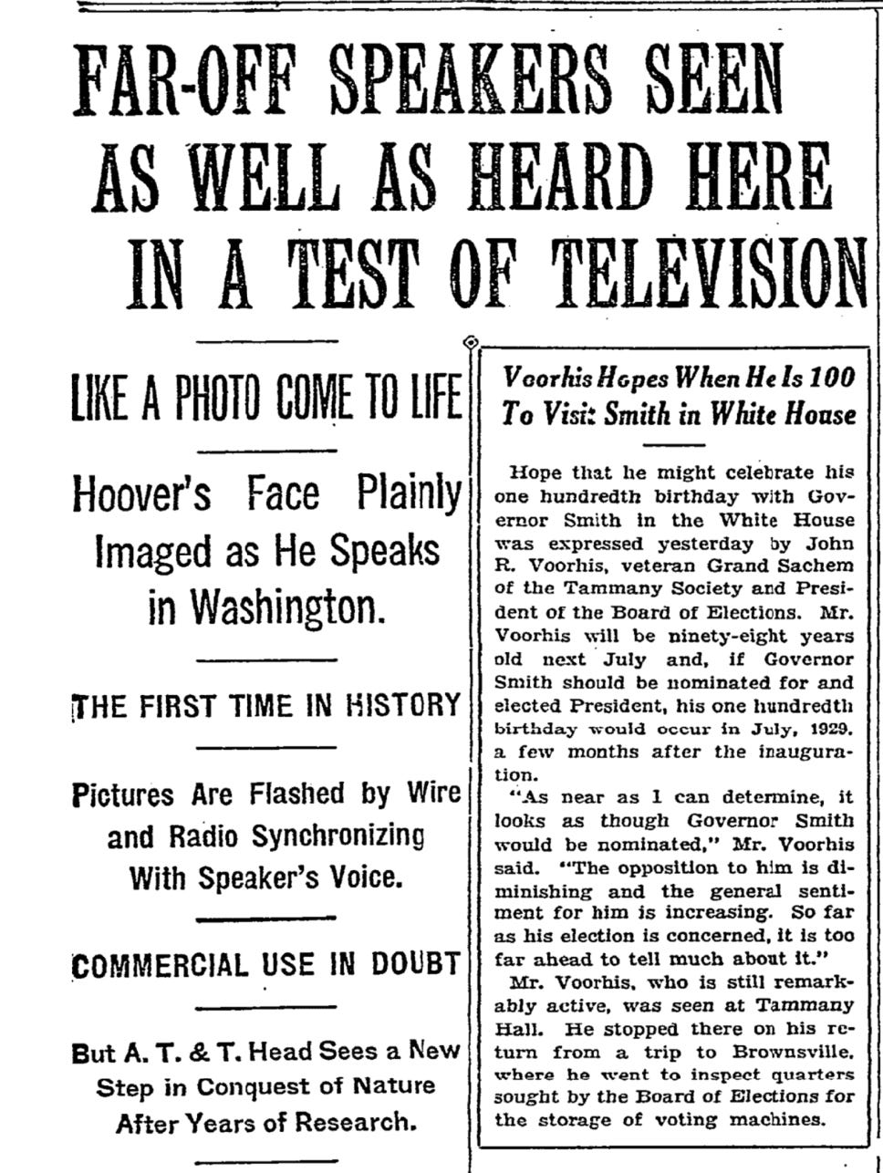 On April 7, 1927, reporters and officials gathered in a New York City auditorium at Bell Telephone Laboratories to witness the first American demonstration of long-distance television. The live image and voice of Commerce Secretary Herbert Hoover were transmitted over telephone lines more than 200 miles from Washington, D.C., to the midtown Manhattan crowd — Hoover declaring that “human genius has now destroyed the impediment of distance in a new respect”.