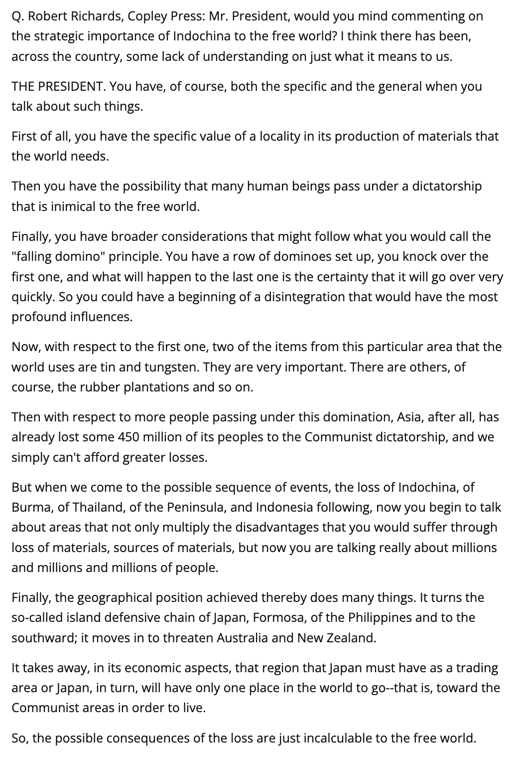 On April 7, 1954, President Dwight D. Eisenhower held a press conference in which he articulated what became known as the “domino theory” — the idea that if South Vietnam fell to communism, the surrounding nations of Southeast Asia would topple in rapid succession, like a row of dominoes. France was already on the verge of catastrophic defeat at Dien Bien Phu, and Eisenhower framed the stakes in existential terms: the loss of Indochina, Burma, Thailand, Malaya, and Indonesia — threatening even Australia and New Zealand.